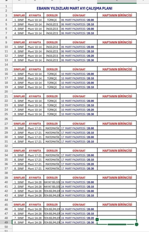 Eba'nın Yıldızları Mart Ayı Çalışma Planı